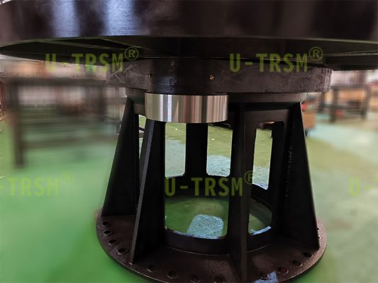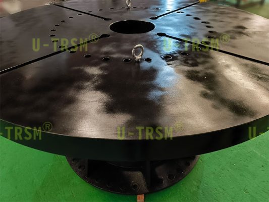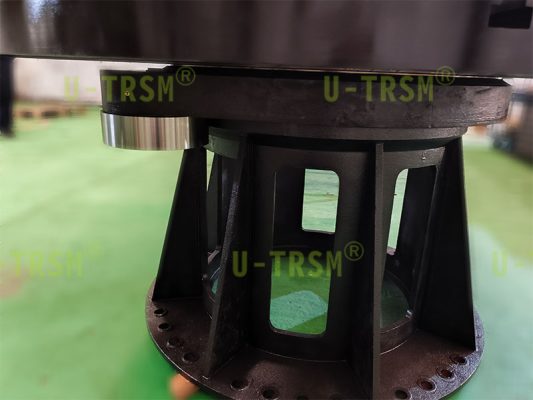 This integrated slew drive is combined with a rotating platform. The customer requires the maximum load of the platform to be 3t, the diameter of the rotating platform is required to be 2m, the platform speed is 12r/min, and the rated output torque is ≥ 13KN.m. U-TRSM design engineers have developed this slew drive according to customer needs, integrated design of base and platform, through the customer’s load and other practical application conditions, according to finite element design analysis, determine the slew drive model, base and platform material and thickness and other parameters.